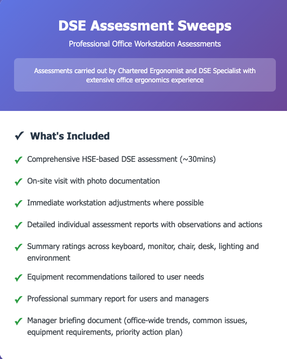 I provide comprehensive DSE assessments across Northern Ireland including Belfast, Derry, Newry and surrounding areas, helping your organisation meet legal obligations whilst protecting employee wellbeing. With experience carrying out hundreds of DSE assessments for corporate clients at Humanscale across both home and office workstations, I deliver expert evaluation and practical solutions.