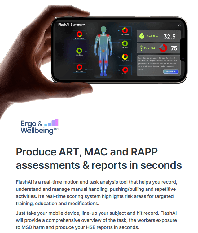FlashAI is a real-time motion and task analysis tool that helps organisations record, understand and manage manual handling, pushing/pulling, repetitive activities and awkward postures such as bending, reaching, twisting and overhead work.