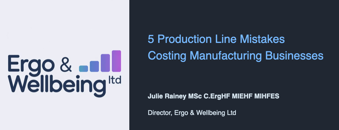 Join Julie Rainey MSc C.ErgHF MCIEHF MIHFES, Chartered Ergonomist & Human Factors Specialist and Director of Ergo & Wellbeing Ltd, for a practical webinar on production line Ergonomics.