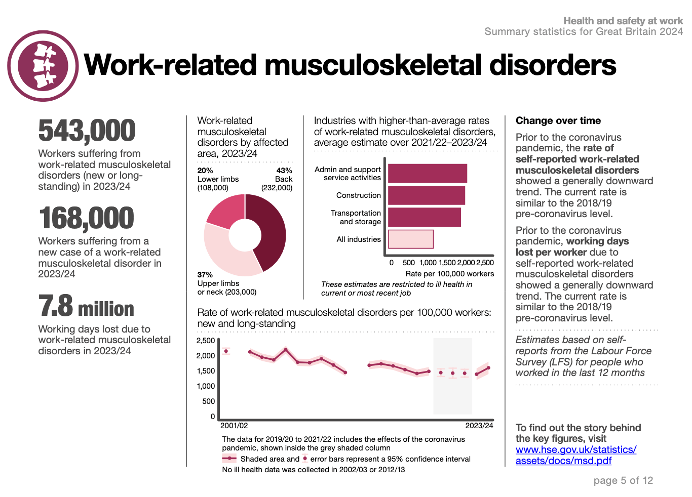 For detailed statistics, see the Health and Safety Executive resource: Page 5 of 12: Work related musculoskeletal disorder statistics (WRMSDs) in Great Britain, 2023/24
